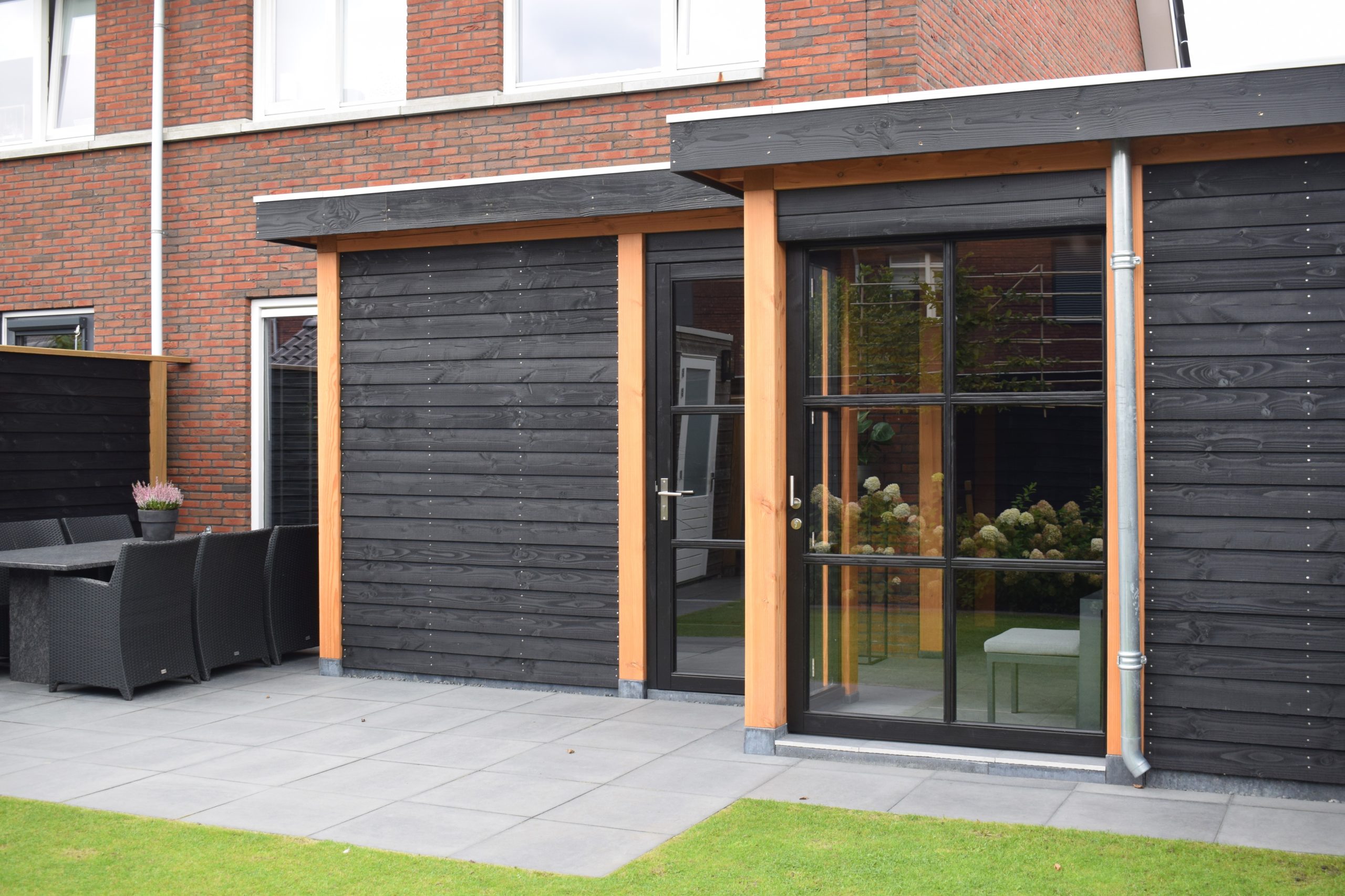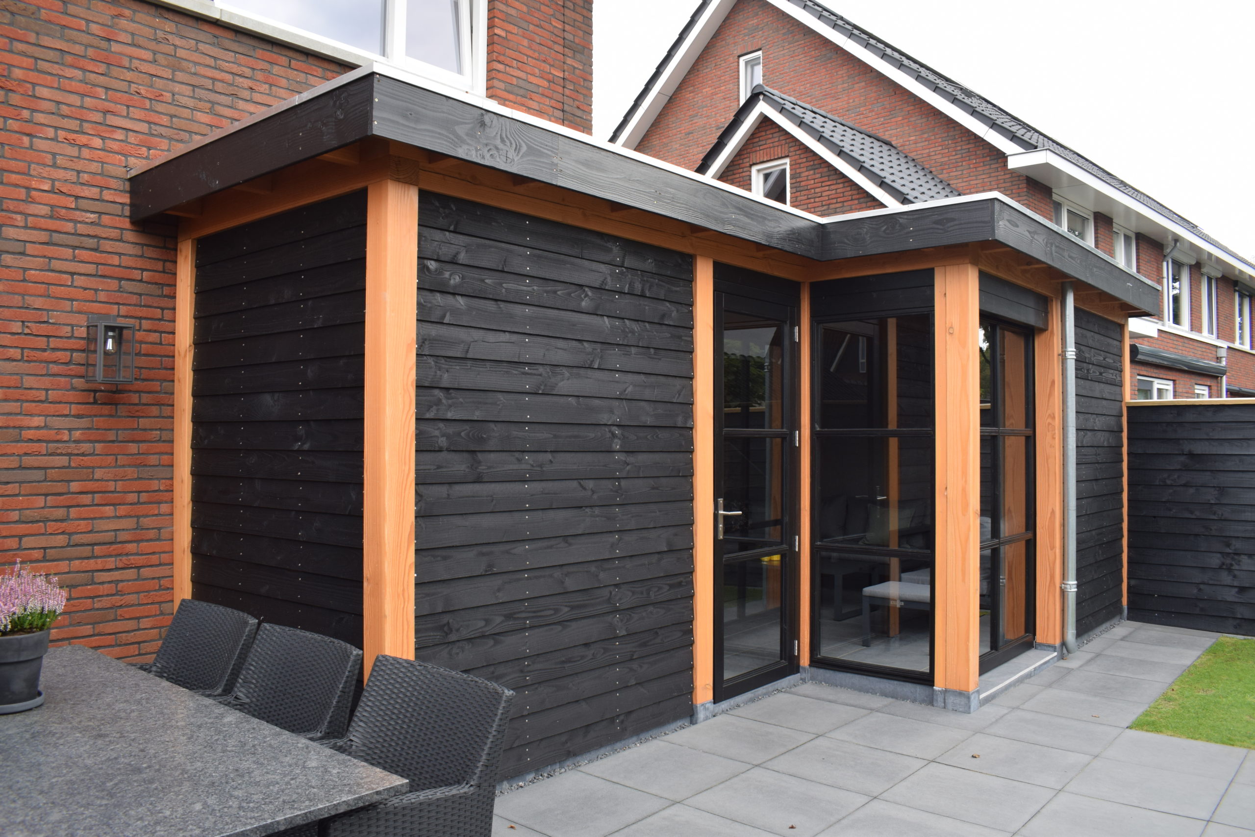 Dit buitenverblijf van Toplawood staat tegen de woning. De wanden hebben industriële ramen. De gevel is afgewerkt met douglas zweeds rabat in zwart gespoten. De zinken goot maakt het geheel strak en duurzaam.
